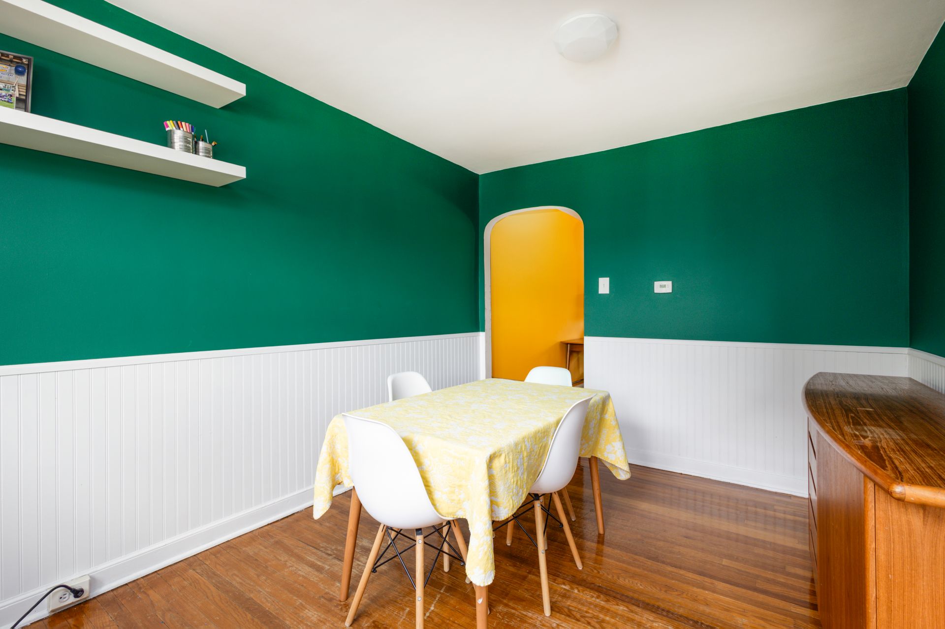 Step into a spacious living room with sunny windows and wood floors that extend throughout the home. The adjacent dining room features elegant wainscoting, leading to a remodeled kitchen equipped with stainless steel appliances, gas cooking, a built-in microwave, dishwasher, and durable solid-surface countertops. Just off the kitchen, enjoy convenient access to an elevated rear patio overlooking the driveway and a compact backyard—ideal for entertaining or relaxing.